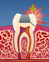 Tenner med store fyllingerI tenner med store fyllinger, er tannsubstansen rundt fyllingen svekket. Når man tygger, kan det etter hvert utvikles tynne sprekker i tannen. Disse sprekkene utvikler seg under fyllingen og forløper vanligvis på skrå bort fra tann-nerven. Over tid kan slike sprekk- dannelser medføre at en del av tannen knekker og faller ut. I noen tilfeller knekker tannen fordi man tygger på noe hardt, men ofte er dette ikke tilfelle. Det er heller den totale belastningen over tid som er utslagsgivende og tidspunktet for tannfrakturen er ofte tilfeldig.
