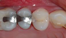 3.Etter at hullet er rent, setter man på en forskaling (matrise) og klargjør tannen for fyllingen. Fyllingsmaterialet krymper når det herder. Det er derfor nødvendig å legge fyllingen i flere mindre porsjoner.