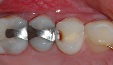 1. Her ser vi et eksempel med en tann der kariesangrepet går inn i dentinet. På grunn av størrelsen, kan det ikke stoppes med grundig renhold og ekstra fluor. Det er derfor nødvendig å reparere tannen med en fylling.