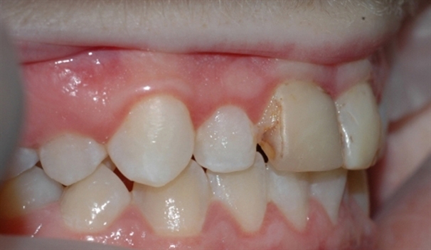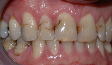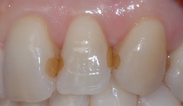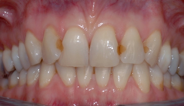 Bildet viser tenner med diverse synlige fyllinger. Flere av fyllingene er dårlig tilpasset og har hull i kantene.