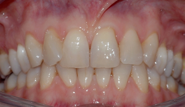 Bildet viser tenner i overkjevens front med diverse synlige fyllinger. Pasienten ønsket å bytte fyllingene da de virket skjemmende i et ellers pent smil.