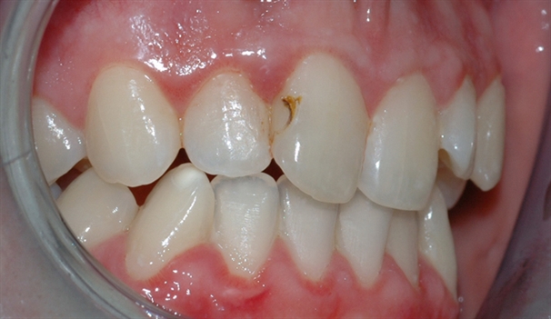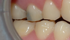Bildet viser en tann med blålig misfarging, som følge av gjennomskinn fra en amalgamfylling.