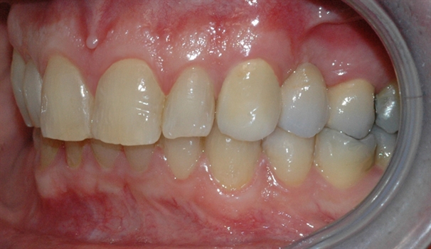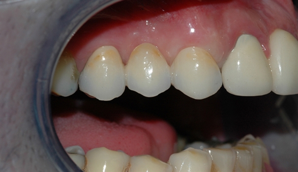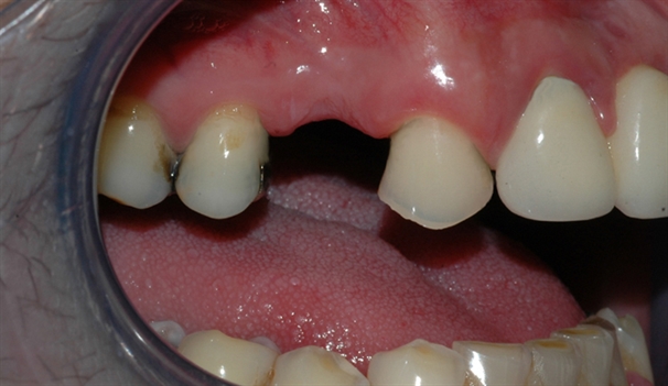 Bildet viser en manglende tann i overkjeven. Nabotennene har fyllinger og tilfellet egner seg derfor godt for brobehandling.