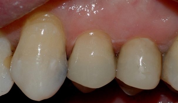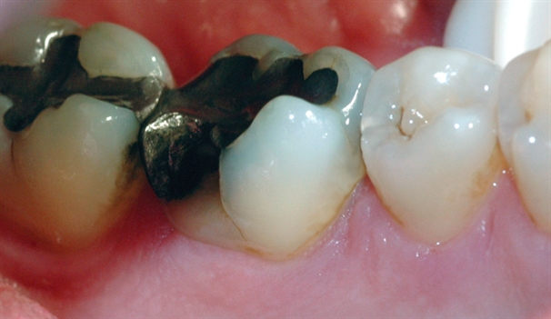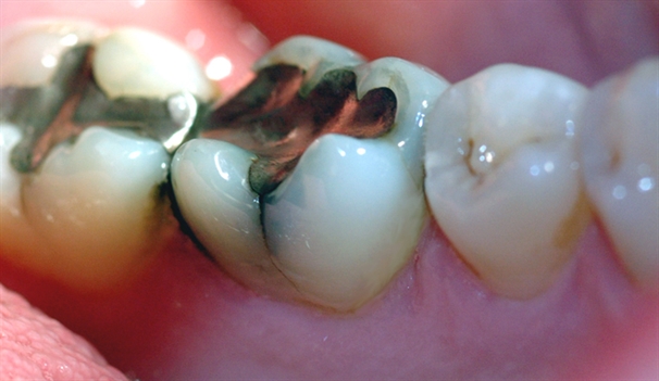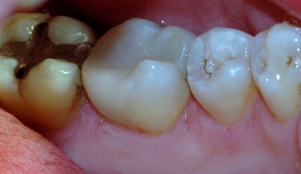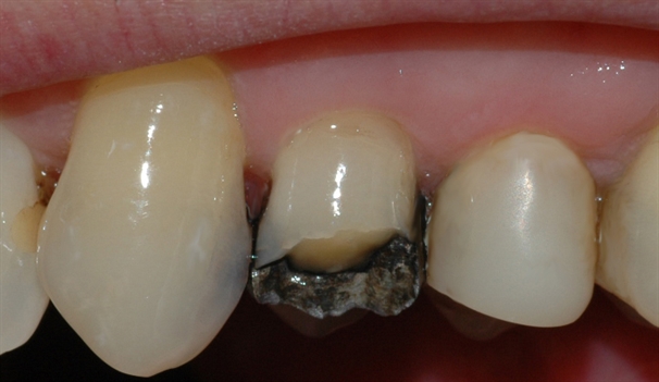 Bildet viser at den gjenstående amalgamfyllingen er fjernet, og at tannen er bygget opp igjen med en plastfylling.